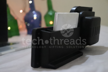 The product displayed is a travel charger, that connects into cars and charges electronics through the same. It is compatible with smartphones, tablets, MP3 players, and such. It also has a special stainless-steel tip for emergency window breaker functions, and can charge 2 devices at full speed at a time. It comes in two colours; black and silver.